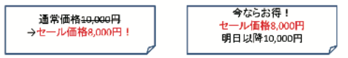 本稿では、二重価格表示のうち、上記とは異なる、将来の販売価格を比較対照とするものについて、最近の行政処分事例も踏まえてご説明いたします。下記のように、セール期間経過後により高い価格になることを訴え、「今ならお得」と思わせる表示のことです。