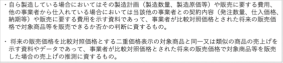 とされています。このように、従来より将来の販売価格を比較対照価格とする二重価格表示は、相当限定的な場合にのみ認められてきました。